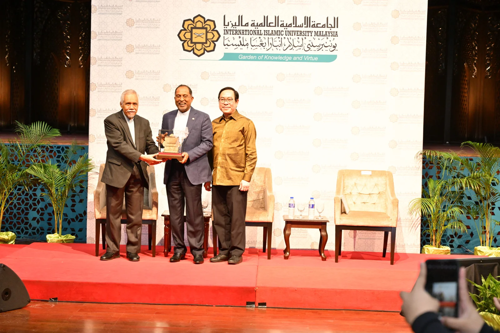 Rektor International Islamic University Malaysia (IIUM), Osman Bakar (paling kiri), menyerahkan cendera mata untuk Menteri Zambry, didampingi oleh Direktur Eksekutif Institut Leimena, Matius Ho.